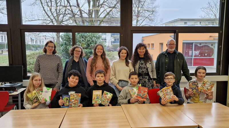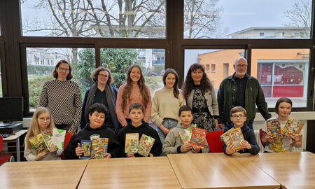 Liana, Helene, Philipp, Elena, Lara, Jonathan, Dejan und Zacki machten sich also an besagtem Freitag auf den Weg zur Schulbücherei, um den Schulsieg für ihre jeweilige Klasse einzuholen. Bei Gebäck und vorweihnachtlicher Stimmung las nun jedes Kind zuerst einen Ausschnitt aus dem eigens dafür vorbereiteten Buch vor, bevor es zur ersten Abstimmung kam. Die Jury, bestehend aus Frau Laier-Nastev (Stadtbibliothekarin), Frau Otto (Inhaberin der Buchhandlung „Tolksdorf“), Branka Göbel (Schulbibliothekarin), Frau Wieden (stellvertretende Schulleiterin), Frau Walter-Fritzsche (Leiterin des F-Zweiges), Herr Strohmenger (Leiter des G-Zweiges) sowie Frau Wolf (Organisatorin des Vorlesewettbewerbs) kürte die fünf besten Leser/innen, die in der zweiten Runde einen fremden Text bekamen, den sie ebenfalls flüssig und sinnvoll betont vorlesen sollten. Die Kinder lasen so gut und lagen so nah beieinander, dass es zu einer zusätzlichen Abstimmung kommen musste, um den oder die Schulsieger/in festzulegen. Doch dann war es so weit: Liana Dengel aus der 6G4 gewann den Schulentscheid und wird im Februar 2026 die Heinrich-Böll-Schule beim Kreisentscheid vertreten. Zweiter wurde Philipp Lotz aus der 6G2. Wir wünschen unserer Schulsiegerin viel Erfolg bei der nächsten Runde und drücken ihr ganz fest die Daumen!