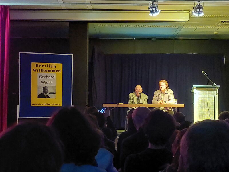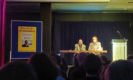In der Aula der Heinrich-Böll-Schule lauschten am 11. März über 300 Zuhörerinnen und Zuhörer, darunter etwa 150 Schülerinnen und Schüler, den Ausführungen des Referenten Gerhard Wiese.
