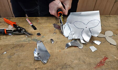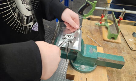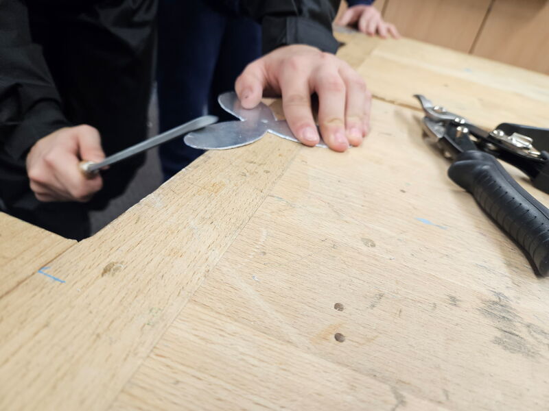 Die Schülerinnen und Schüler lernten unter Anleitung das Anzeichnen der einzelnen Bauteile auf Aluminiumblech, diese wurden im nächsten Arbeitsschritt mit einer Metall-/ Blechschere ausgeschnitten. Die Bauteile wurden mit Feilen entgratet, so dass die Bauteile möglichst glatt und ohne scharfe Kanten waren. Nach dem die Bauteile noch in Form gebogen und gehämmert wurden, durften die Schülerinnen und Schüler in einen Stab ein Gewinde schneiden, auf das die Bauteile montiert wurden- obwohl der Umgang mit dem in der Schule bisher kaum genutzten Material für einige eine Herausforderung war, konnten alle ein fertiges Produkt mit nach Hause nehmen.
