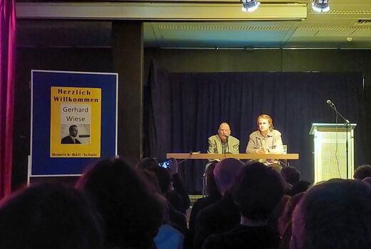 In der Aula der Heinrich-Böll-Schule lauschten am 11. März über 300 Zuhörerinnen und Zuhörer, darunter etwa 150 Schülerinnen und Schüler, den Ausführungen des Referenten Gerhard Wiese.