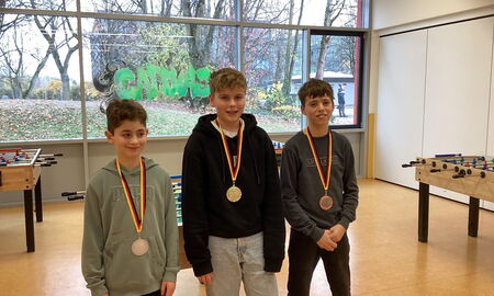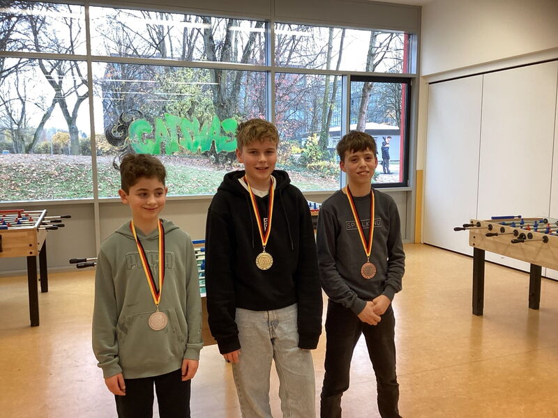 Lukas konnte das Stechen für sich entscheiden, und so spielte er zusammen mit Constantin Hunger (7G3), Muhammed Dautovic (5G1) und Liam Wagner (5G4) im Halbfinale um die Medaillen. Die Finalspiele waren sehr emotionsgeladen, mit teilweise sehr knappen Entscheidungen. In dem epischen Finale ging schlussendlich Constantin gegen Liam als Gewinner des Turniers heraus. Lukas erspielte sich den dritten Platz. Die drei freuten sich über ihre Medaillen und alle anderen Teilnehmer über drei Süßigkeiten als Trostpreis.