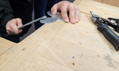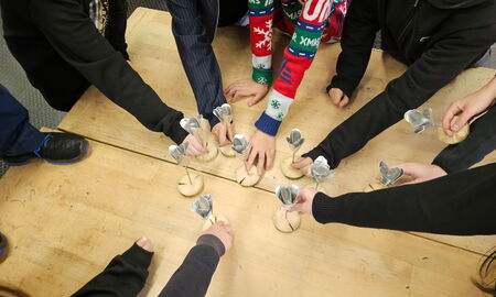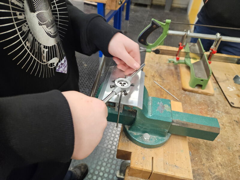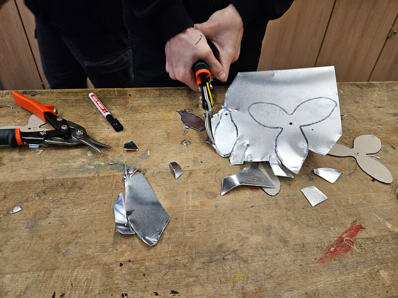 Die Schülerinnen und Schüler lernten unter Anleitung das Anzeichnen der einzelnen Bauteile auf Aluminiumblech, diese wurden im nächsten Arbeitsschritt mit einer Metall-/ Blechschere ausgeschnitten. Die Bauteile wurden mit Feilen entgratet, so dass die Bauteile möglichst glatt und ohne scharfe Kanten waren. Nach dem die Bauteile noch in Form gebogen und gehämmert wurden, durften die Schülerinnen und Schüler in einen Stab ein Gewinde schneiden, auf das die Bauteile montiert wurden- obwohl der Umgang mit dem in der Schule bisher kaum genutzten Material für einige eine Herausforderung war, konnten alle ein fertiges Produkt mit nach Hause nehmen.